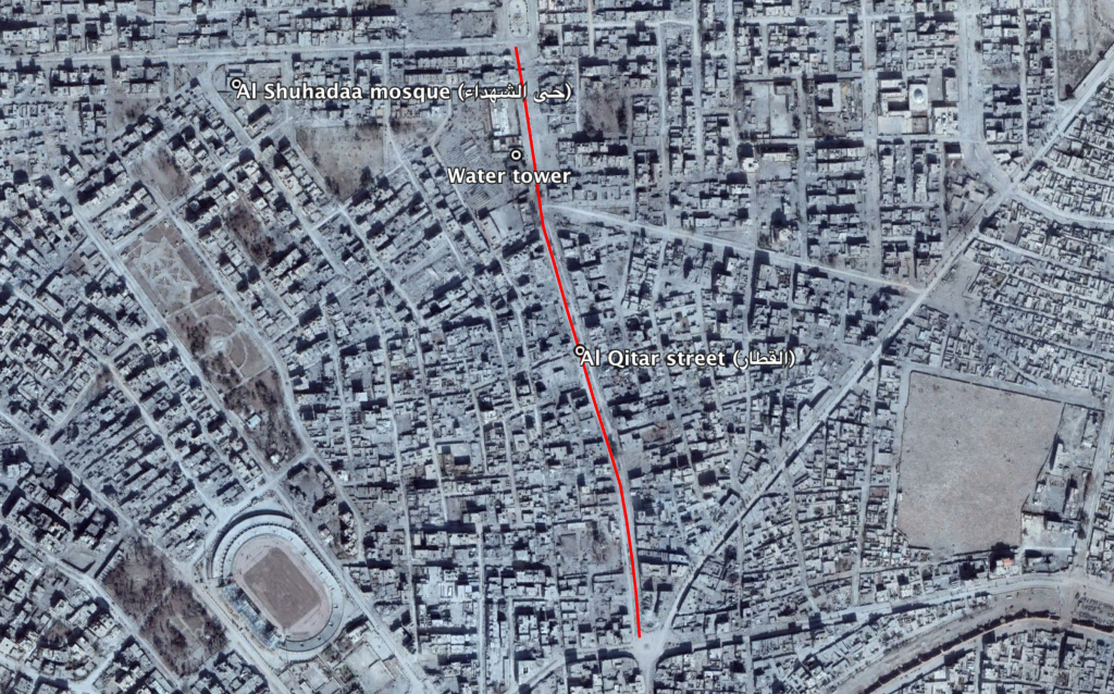 Reports of the incident mention the neighbourhood of Al Shuhadaa mosque (لشهداء حي) near the water tower on Al Qitar street (القطار).