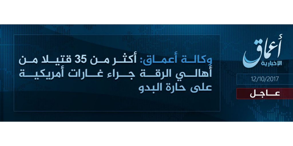 Jisr TV reported, “The agency A’maq [IS propaganda] said the American raids targeted the Bedouin neighborhood, which resulted in the death toll”. It added that this came “after the resumption of military operations yesterday, following the failure of negotiations to exit ISIS out of Raqqa in return for not targeting them”. This account was reiterated in a later report by Step News Agency.