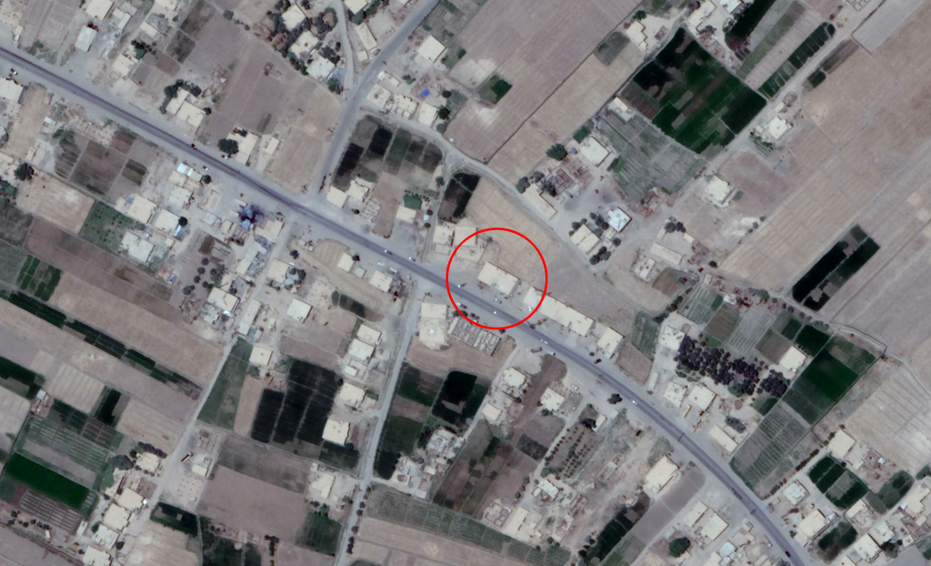The location of the destroyed building in the village of Al Jarthi al Sharqi (الجردي الشرقي), shown in the Euphrates Post and the @Al_Sharqnews video. Airwars geolocated these two sources to 34.884892, 40.635273
