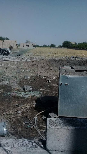 Reports of the incident mention several buildings in Baghuz Fawqani (باغوز فوقاني), the village of Shajlah (الشجلة). Photos and videos from social media show damaged and destroyed buildings (including the remains of a car next to a large crater in the ground) at this location: 34.469968,40.954784