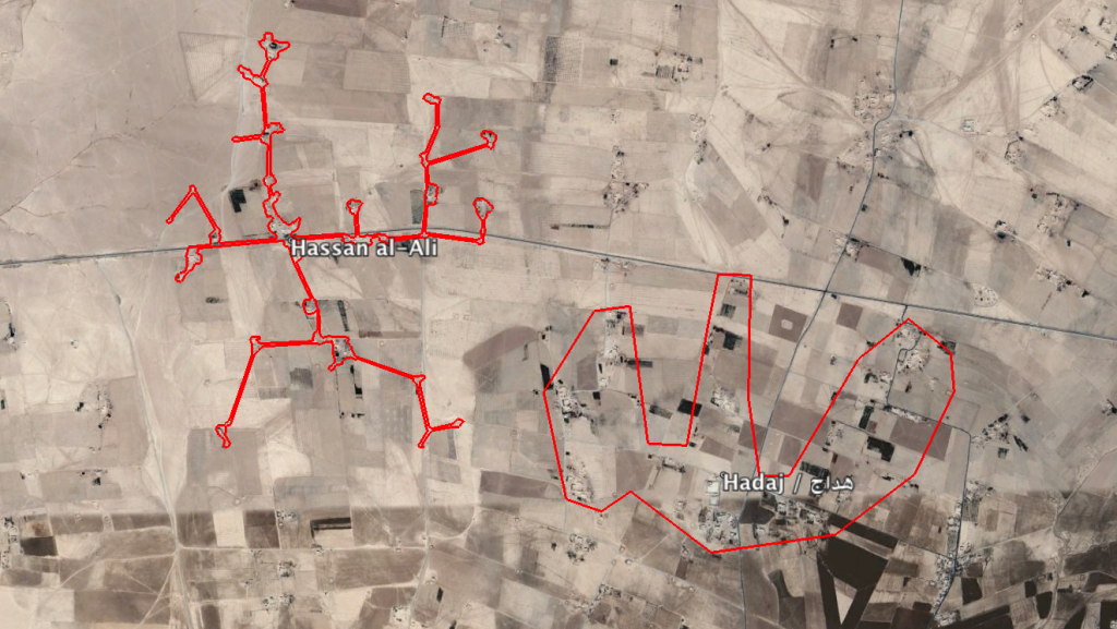 Reports of the incident mention the village of Hadaj (هداج), for which the coordinates are: 36.03078,41.05519, but also “Hadaj West” and “Hassan al-Ali” village/hamlet/farm, for which the coordinates are: 36.043339, 41.030760