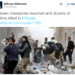 Raqqa is Being Slaughtered Silently published numerous posts on the incident, though reporting was confused. It initially referred only to “warplanes” and did not say who they belonged to. However subsequent reports blamed the regime, while another post referred to the “massacres of the Russian aviation on Raqqa” (referring also to an incident the following day – March 19th – in Raqqa). It said that there had been eight raids targeting residential neighborhoods, including the following locations: