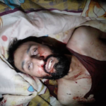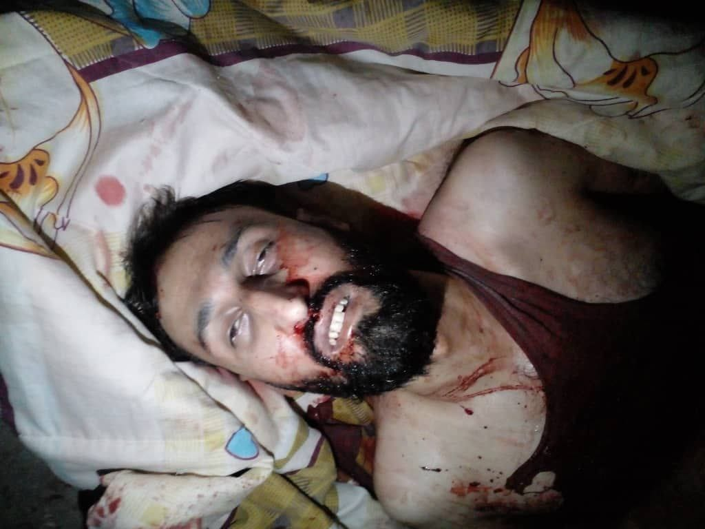 The same graphic photo or set of photos were posted by Al-Hasaka Events, Knights of the Colonel, and the Deir Ezzor Countryside Facebook accounts. They show a man with dark hair and a dark beard lying on a patterned blanket, wearing a dark red vest top. He is covered in blood, and it is unclear if the man is severely injured or had already passed away at the time the photo(s) were taken.