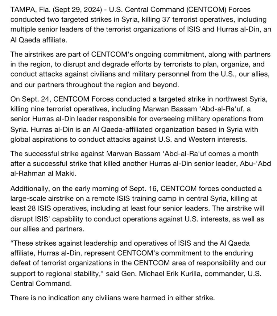 U.S. Central Command (@CENTCOM) in a post via X/Twitter stated that “U.S. Central Command Forces conducted two strikes in Syria, killing 37 terrorist operatives, including multiple senior leaders of the terrorist organizations of ISIS and Hurras al-Din, an Al Qaeda affiliate.” However, as the statement did not specify the location, it is unclear whether they are referring to this incident.