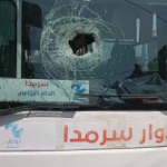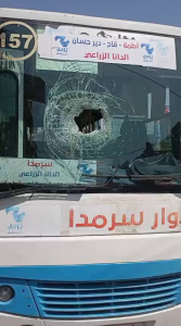 A video shared to Twitter/X by user @SyrianUmayyad shared a video from the passenger bus which was reportedly hit by shrapnel. The videographer approaches the bus from the outside, showing a large hole in the front windshield of the bus. Upon entering, the videographer pans to glass on the ground and an overturned seat. The man taking the video identified the bus as bus 157, saying that it was hit by shrapnel. He said that people were injured inside of the bus and the injured were transferred to the hospital, along with the shrapnel. A boy or young man interjects at one point to say that he has a picture of the munition. As the videographer did not specify exactly how many of the bus’ passengers were injured, referring only to ‘people’, plural, Airwars has recorded the maximum number of injured passengers as two.