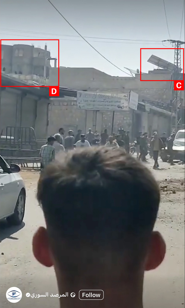 Reports of the incident mention a car being struck in Atmeh (أطمة). Analysing audio-visual material from sources, we have narrowed the location down to the following exact coordinates: 36.297289, 36.699191.