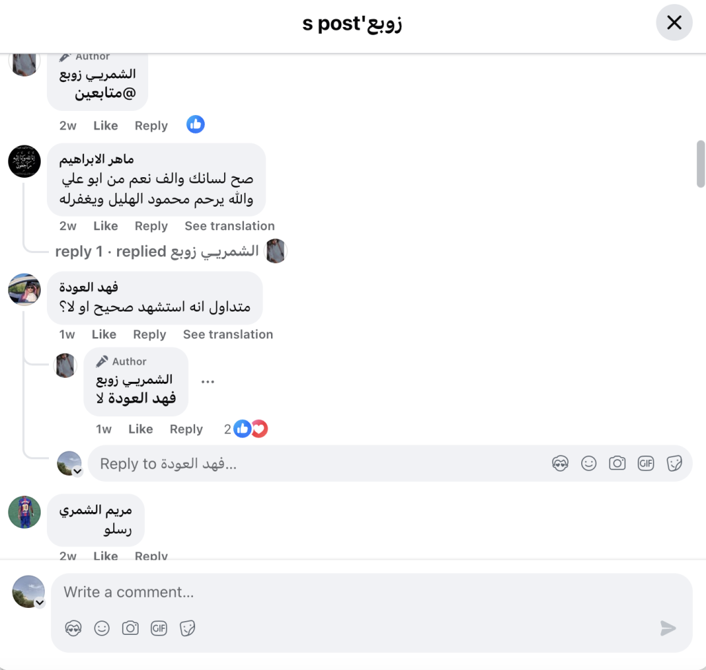 Some reports, like those from Facebook users Atallah Al-Zubaidi and Ziyad ibn Shammar al-Zuba’i said that Ala’a was killed. However, a back-and-forth on Facebook user Al-Shammari Zoba’a’s post found that Ala’a was not killed. Specifically, Al-Shammari Zoba’a shared a TikTok video that showed a picture of Ala’a, with the caption “Dying in defense of the land is an obligation and a tradition.” Another Facebook user, Fahed al-Awda, commented on Shammar’s post, saying that reports that Ala’a was killed were circulating, and asked if they were true. Shammari responded “no.”