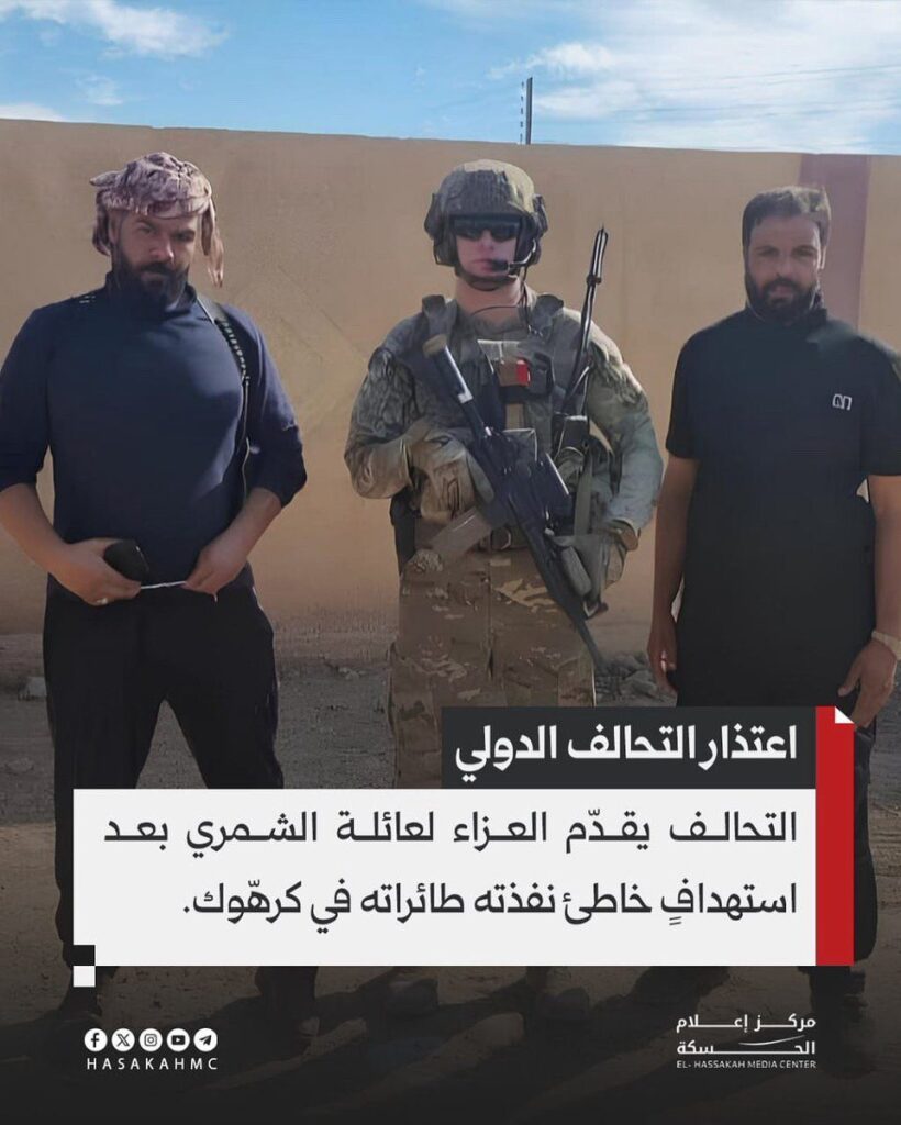 Facebook users Free Hour Channel and Nawaf Hakim Al-Rakkad reported that the “International Coalition offered its condolences to the family of civilian Mahmoud al-Halil al-Shammari,” claiming that the Coalition carried out the airstrike “based on a false report from the SDF militia about the presence of ISIS elements.” This was widely repeated across subsequent sources, but was not confirmed by the Coalition itself.