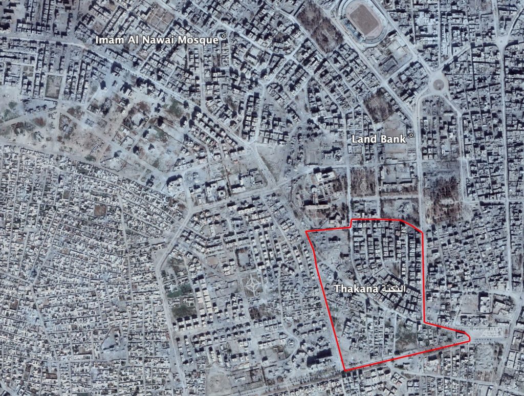Reports of the incident mention the Land Bank (البنك العقاري), the area near Imam al-Nawai Mosque (الإمام النووي) and Al Thakana neighbourhood. The coordinates for the Land Bank (البنك العقاري) are: 35.952613, 39.008061. The coordinates for Imam Al Nawai Mosque (الإمام النووي) are: 35.956327, 38.999390. The coordinates for Al Thakana are: 35.9478905, 39.0067863.