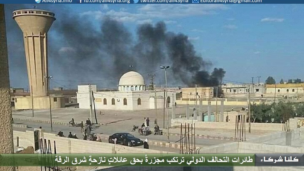 Smart also said that the raids were likely carried out by the Coaliton. It reported that “warplanes launched raids on the town of al Karama (about 25 km east of Raqqa), and the nearby villages of Ghassaniya and Jadid Khabour and Kleib, which resulted in a number of deaths and injuries. A medical source reported that nine were killed and 18 wounded, including two children and three women, who were taken to the National Hospital in Raqqa.” Zaman Alwasl put the death toll higher at 14 including six children.