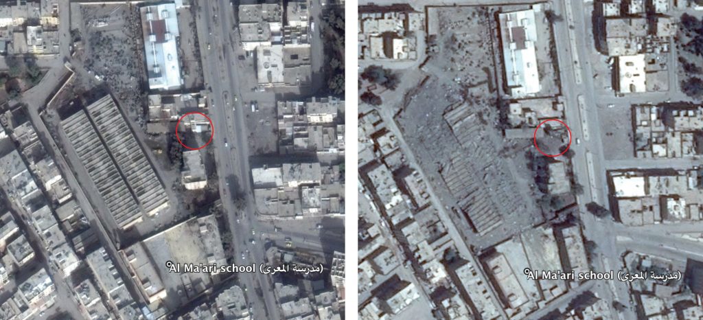 Damage seen of the warehouse behind Al Ma'ari school (مدرسة المعري), the water tower seen on RBSS images marked in red (left: January 7, 2017; right: May 18, 2017)