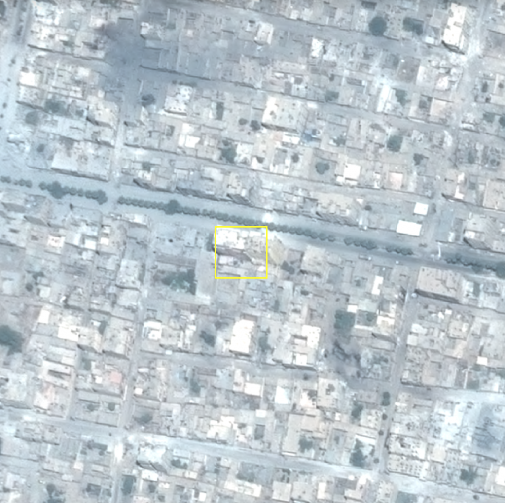 The building in which 4 members of the Thalji family were killed seen on satellite imagery after the strike (July 6, 2017)