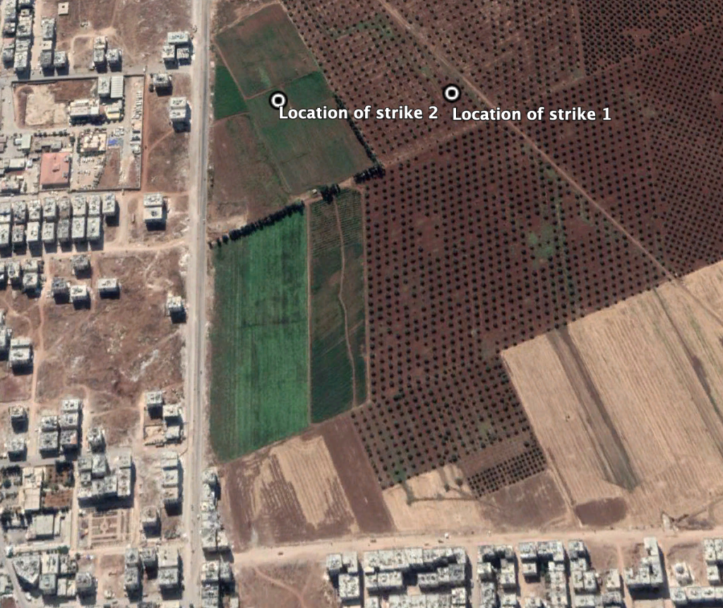 Reports of the incident mention the city of Afrin (عفرين). Analyzing audio-visual material from sources we have narrowed down the location to an area just west of the city, for which the exact coordinates are: 36.5112804, 36.851089.