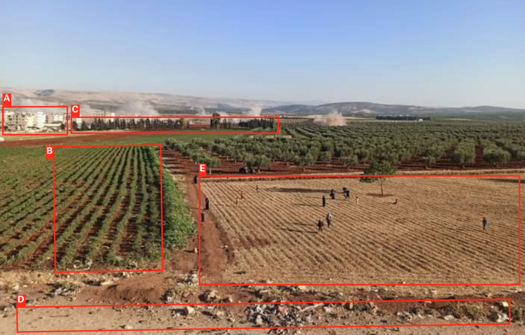 In audio messages to Syrian Archive, a journalist and a witness of the shelling said, “The first bombing was at 18:03 on farm lands and civilians’ homes.” According to this same journalist, among those killed was Ghaith Abbas, a fighter from the city of Homs. Additionally, the journalist claimed that two other fighters were wounded in the attack.