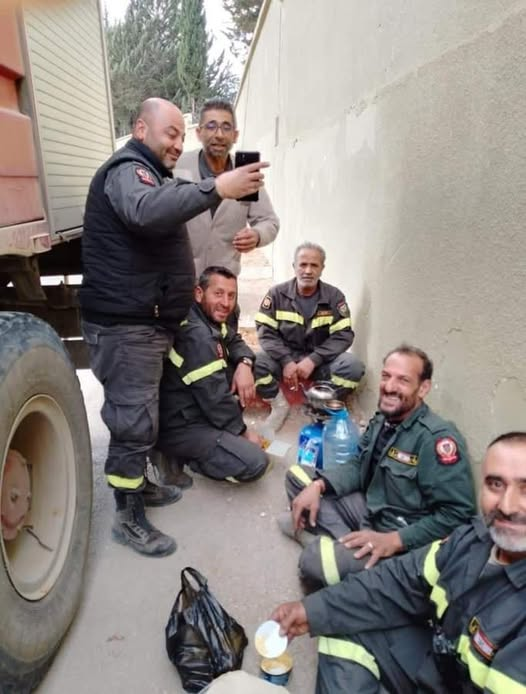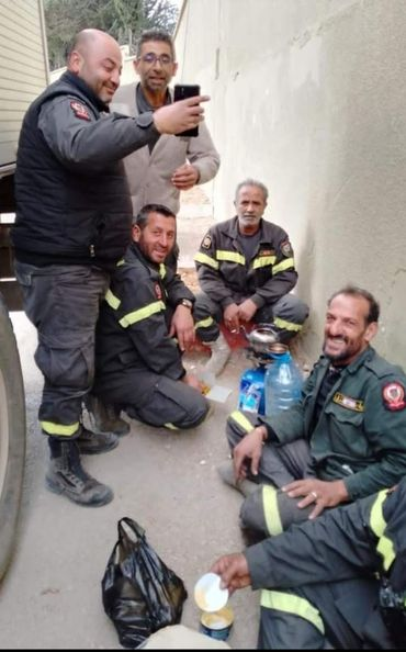 A post uploaded by the Facebook user Linda Abdo listed 13 of the victims, calling them “heroes” who “are not numbers” and asking that their names be remembered. It included two photos, the first depicting six men in civil defense uniforms resting next to a wall. Ali Karkaba, who appears to be an older, middle-aged man, was most clearly identifiable in the centre, matching his appearance in other photos posted by users in which he was named. The second image depicted eight smiling men posing in their civil defense uniforms.