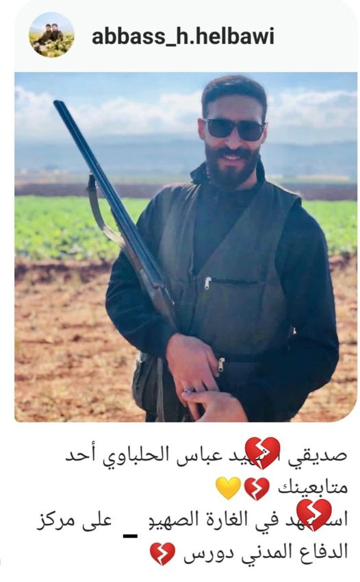A photo uploaded by the Facebook user Mona Helbawi indicated that one of the casualties, Abbas Hussein al-Halabawi, was affiliated with Hezbollah. In the photo, he appeared in a Hezbollah portrait plastered on a wall, alongside a portrait of a possible relation, Mahdi Adnan al-Halabawi. Additionally, a post by the account Antique Abou Ali from November 14 referred to Abbas Hussein al-Halabawi as a martyred “mujahid”. On Facebook, Medad Allsamaa shared a picture of the late Abbas holding a gun. Therefore, Airwars considers him a militant.
