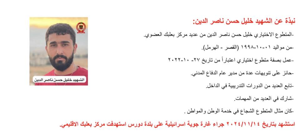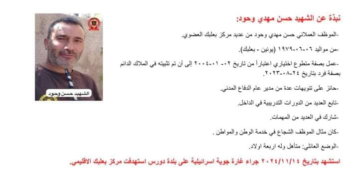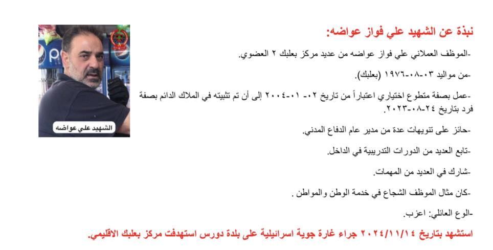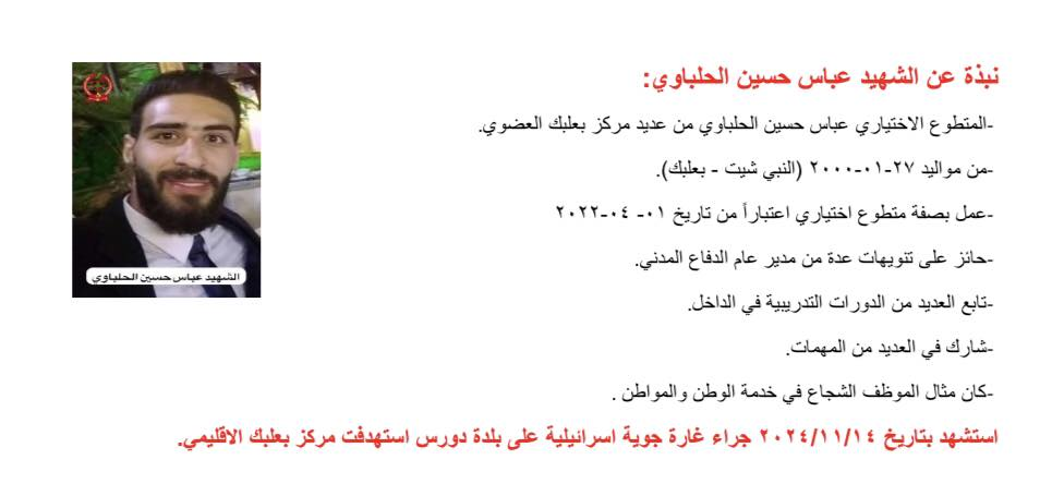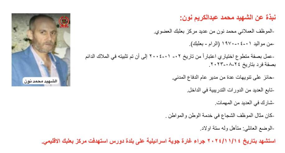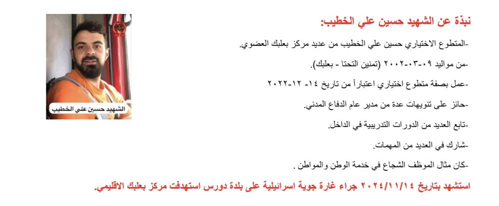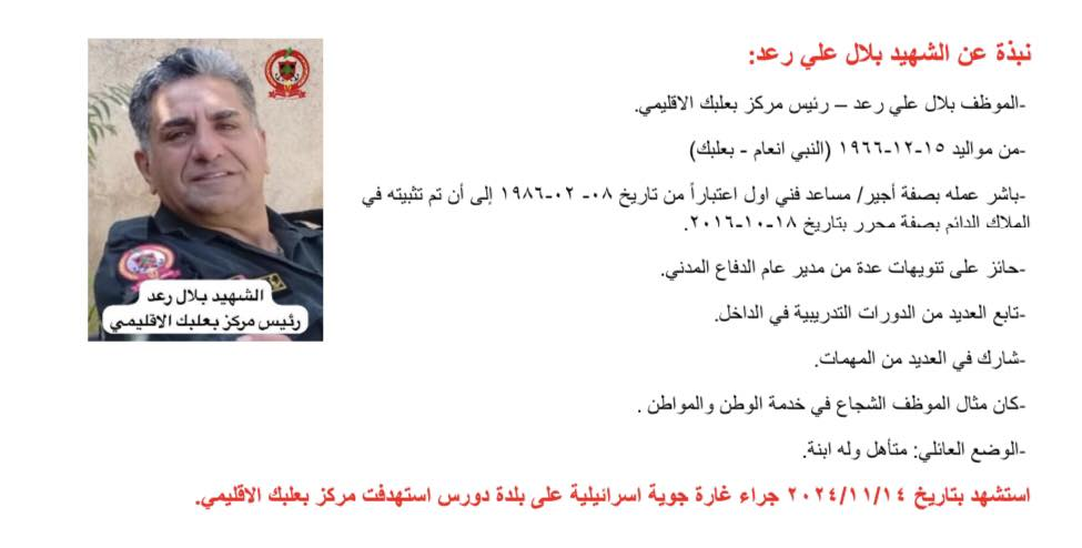 Bintjbeil.org, a Lebanese news organisation, posted a statement by the mayor of Baalbek, Mustafa al-Shall, to its Facebook page, mourning the head of the civil defense centre in Durrus, Bilal Raad. The statement describes Bilal as a “lover of Baalbek and its people,” who enthusiastically performed his role and was willing to fulfill “any duty, regardless of the risks.”