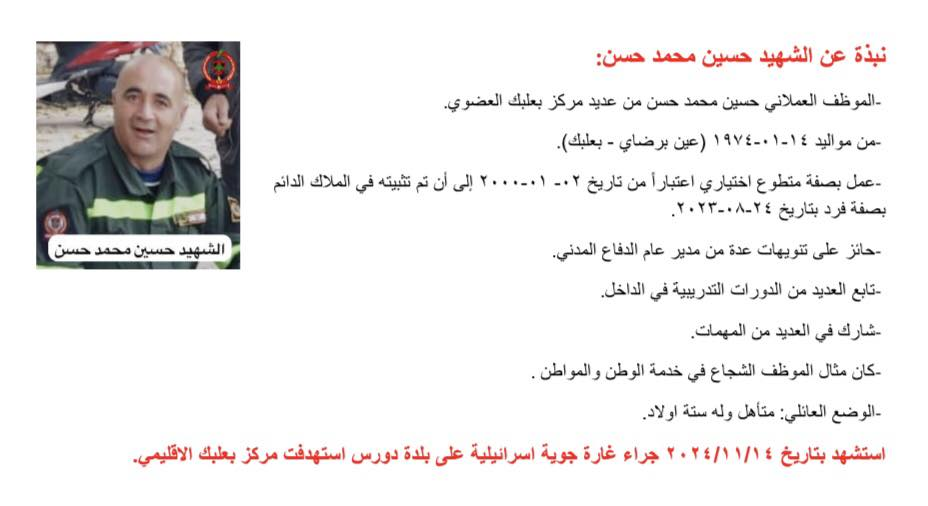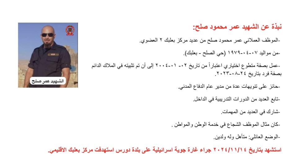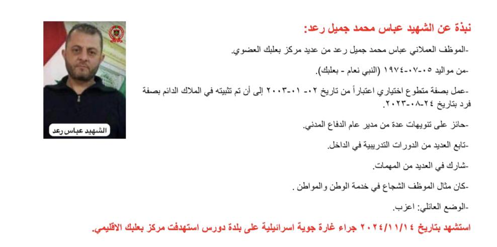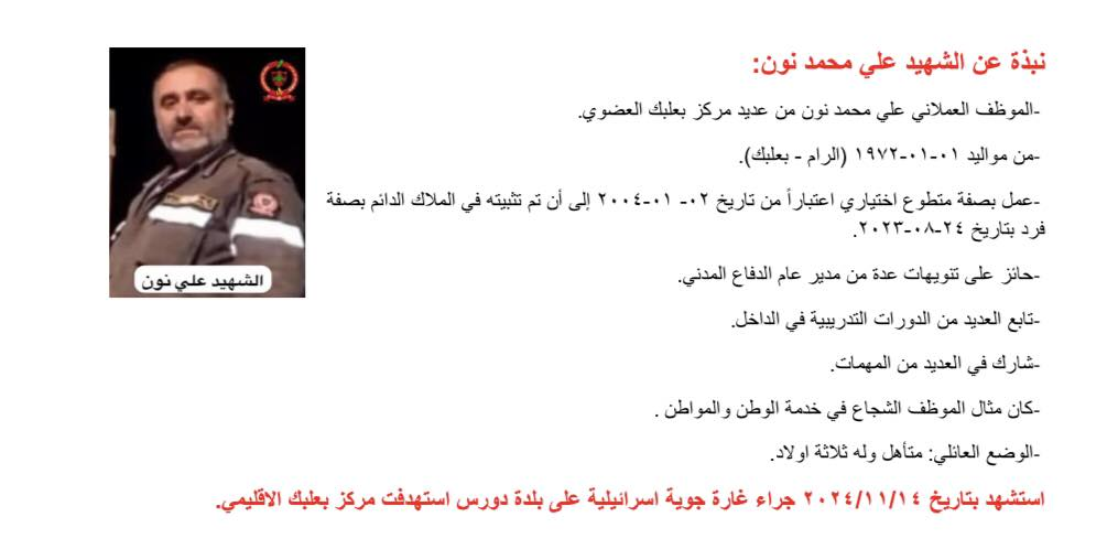 On the evening of Thursday, November 14, 2024, an alleged Israeli airstrike struck the Civil Defense Centre in the town of Durrus (Douris) in Baalbek, eastern Lebanon, killing at least 14 civilian members of the civil defense, all adult men: head of the center Bilal Raad, Hussein Hassan, Khalil Nasser al-Din, Ali Noun, Ali Karkaba, Hussein al-Khatib, Ahmed Hamza, Hassan Mahdi Wahoud, Haider al-Zein, Ali Awada, Omar Solh, Abbas Raad, Hussein Karkaba, and Muhammad Abd al-Karim Noun; and one Hezbollah-affiliated member: Abbas Hussein Al-Halabawi. Up to five civil defense members were injured, and the building of the civil defense center was reduced to rubble.