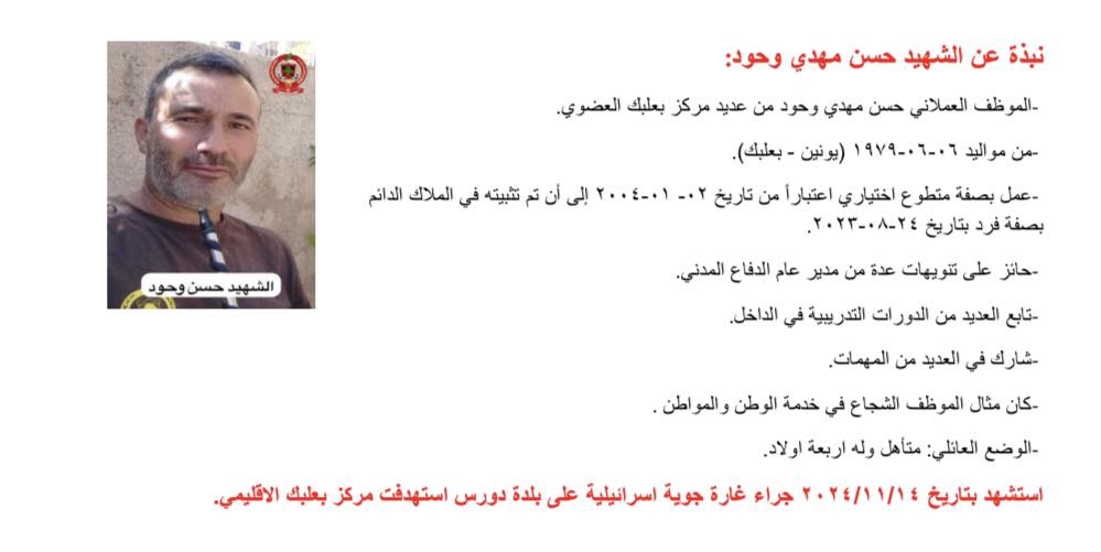 Another Facebook user, Zaianb Haidar, posted a photo of Hassan Mahdi Wahoud in his civil defence uniform, alongside a caption identifying him and praising him as a “lifesaver.” His nephew, Hussein Haidar, also made a post that describes his pride in Hassan and mourns his death.