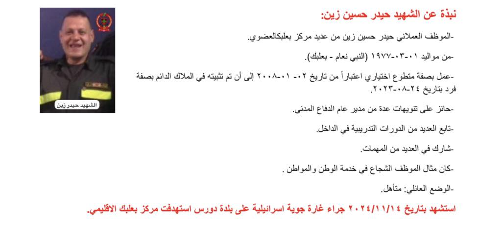 An article published by the Qatari media organisation Al Araby on November 15, 2024, reported that 15 people had been killed in the attack, all of whom are separately mentioned in a number of social media posts from a range of accounts. Although none provided a fully exhaustive list of the casualties, the Lebanese General Directorate for Civil Defense uploaded images of 12 profiles, identifying each casualty and listing general achievements and history of civil defense workers.