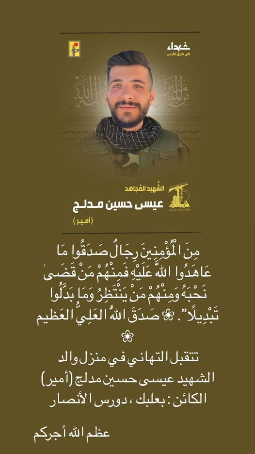 Posts on social media, including a Facebook post by user @Nana.raad, identified 11 of the fatalities as Mohammed Hussein Harb Amhaz, his wife Hawra Madlaj, their young daughter Sama Muhammad Hussein Amhaz, Watfa Madlaj, Souad Medlej, Souad’s son Abbas Adnan Raad, Ward Amhaz, Hussein Kamel Madlaj, Hassan Hussein Madlaj, and Iman Ali al-Sablani. This post also mentioned Issa Hussein Madlej. However, an image later shared on Facebook by Zahraa Medlej Mazloum appeared to show Issa Hussein Madlej in a Hezbollah uniform, with the Hezbollah logo imprinted beneath him. As such, Issa Hussein Madlej has been classified as a militant.