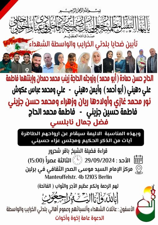 Nour Mohammed Ghazi and three of her children, two daughters, Zahraa Hassan Jazini, Rayan Hassan Jazini, and a son Mohammad Hassan Jazini were also killed in the attack. Fatima Hussein Jazini was also listed as a victim in the strike. It is unclear whether she was related to the aforementioned Nour and her children.