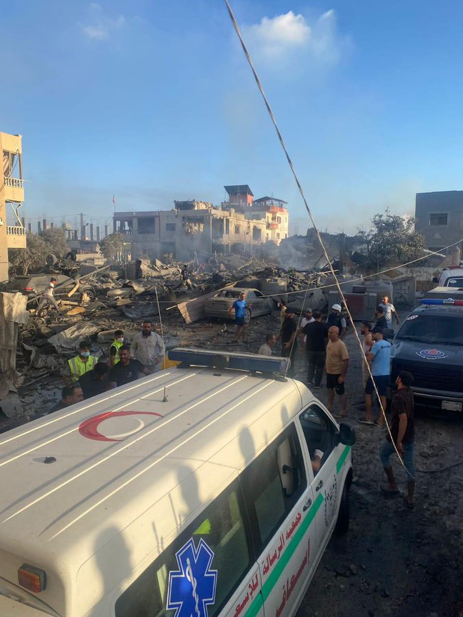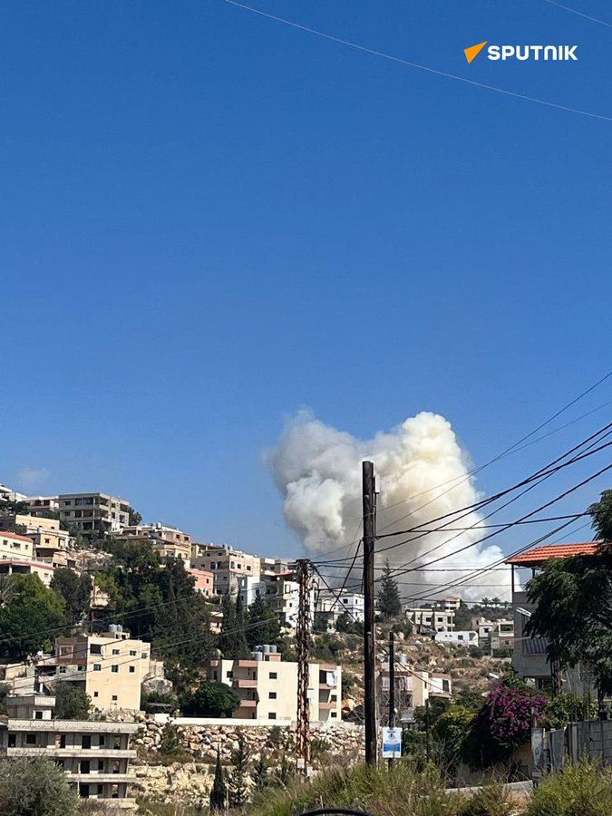 Twitter/X users @YeniSafakArabic and @sputnik_ar were the first to report the alleged Israeli strike on Al-Saksakieh at 1:01 PM and 1:05 PM, respectively. @Sputnik_ar also shared a photo showing a white cloud of smoke rising over the residential buildings. It is unclear if the image shared by @Sputnik_ar depicts, from a distance, the strike that hit the Haider family home, or one of the other reported strikes in Al-Saksakieh on the 23rd.