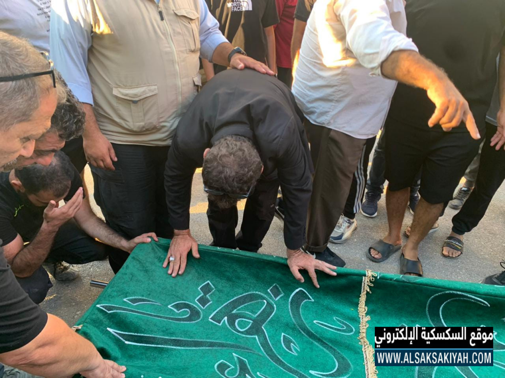 A Facebook post from Al-Saksakieh Website shared eight images on September 25th, with the caption “The funeral of the late Hasnaa Abbas Haider in Al-Saksakieh.” The images show what appears to be a rectangular coffin, shrouded in a green cover with gold tassels. A verse form the Quran also appears to be written on the fabric cover in dark cursive. Across the photographs, a crowd of men are seen carrying the coffin.