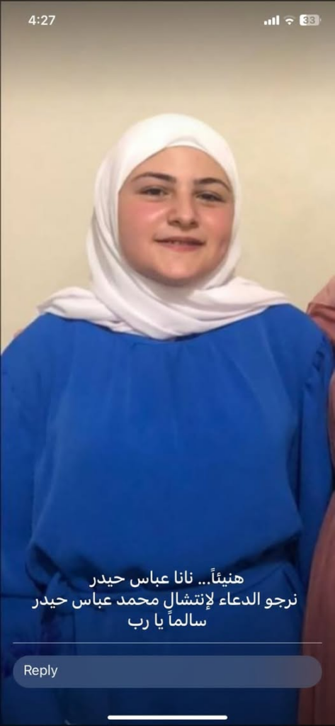 Hajja Fatima Faqih, wife of Hajj Abbas Haidar, was killed alongside her daughter Hasnaa Abbas Haider. Fatima’s son Mohammad (Mhmd) Haider was reportedly injured. Posting to TikTok, Mohammed, (@mhmd_haidar) posted a series of videos about the tragedy. Specifically, Mohammad shared images of his mother Fatima and sister Hasnaa, along with videos of the destruction to his family’s home and vehicle.