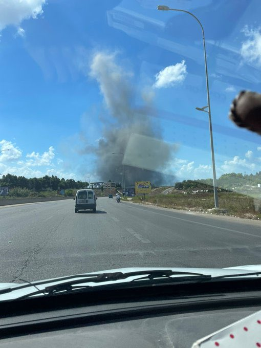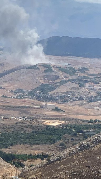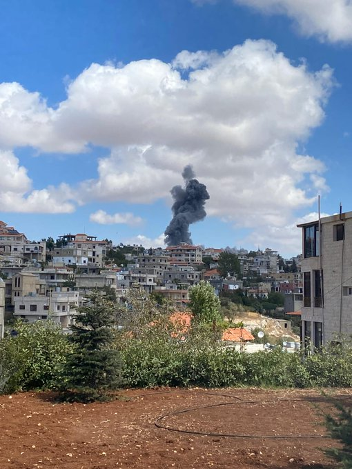 Posting to Twitter/X, user @akhbaralyawm shared photos depicting areas that were struck during different points in the day. A thick cloud of dark smoke rising over a dense gathering of residential buildings, situated on a hill, seems to be associated with the incident involving Hassan’s home. That said, it is possible that one of the three other images shared by @akhbaralyawm is tied to this particular strike. One of these three images shared by @akhbaralyawm depicts a more rural scene, with a residential building to the left of the frame, a large plume of dark smoke coming from an area obscured from view by a tree, and a political poster, potentially associated with AMAL, situated to the left of the frame.