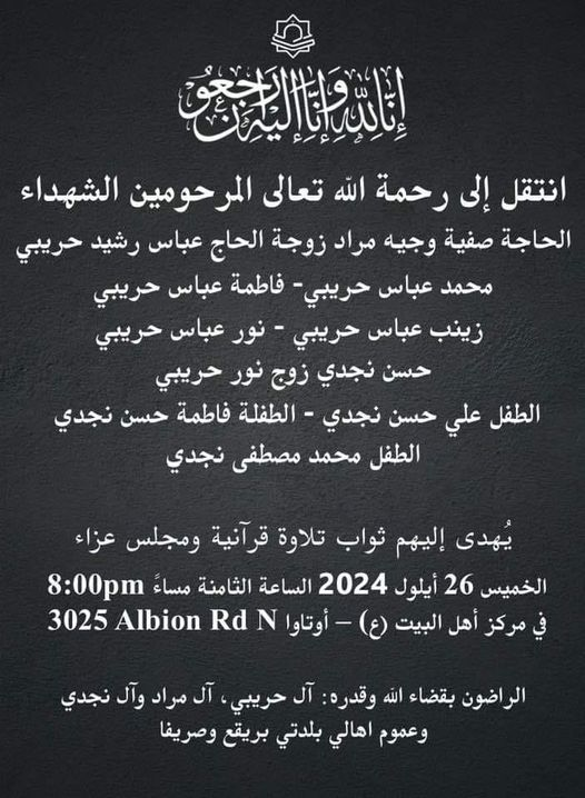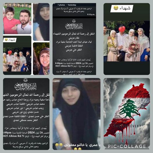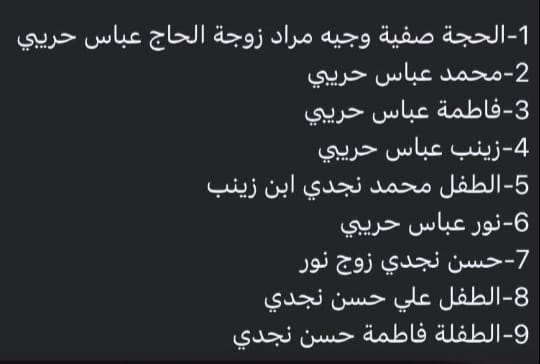 Haja Safiya Wajih Murad, wife of Hajj Abbas Haribi, was killed alongside her son Muhammad Abbas Haribi, her three daughters – Fatima Abbas HaribiZainab Abbas Haribi, and Nour Abbas Haribi, her son-in-law, Nour’s husband Hassan Ali Najdi and her three grandchildren, children of Zainab and Nour – Ali Hassan Najdi and Fatima Hassan Najdi, and a child of Zainab, Muhammad Mustafa Najdi. Hassan Ali Najdi has been classified as a militant by Airwars after a post on Facebook by Sarah Najdi depicted Hassan as a martyr of militant group Hezbollah. Muhammad Abbas Haribi has also been classified as a militant as he was pictured in camouflage by multiple sources including Asmaa Ahmed Tawfik, and referred to as a “mujahid”.