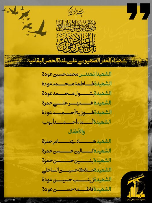 An image with the list of fatalities was posted by Muntather on Facebook alongside a Hezbollah party logo. While Hezbollah operates an active militant wing, their political presence is also deeply enmeshed within the state, providing social and organisational services, primarily in the Shia majority areas in Southern Lebanon, the Beqaa Valley, and the suburbs of Beirut. With this context in mind, and given that there is no indication of militant activities, Airwars has not taken this to mean that those killed were militants. This assessment will be updated should further information come to light.