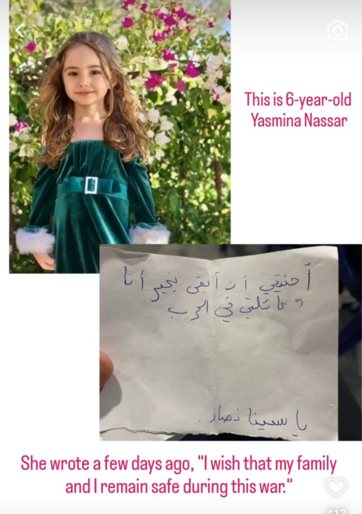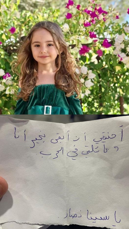Multiple sources shared photographs of the family, and in particular, Yasmina. She had written a note, subsequently widely shared on social media, where she expressed her hope for her family’s safety. “My wish,” she wrote, “is that my family and I remain well in the war.”