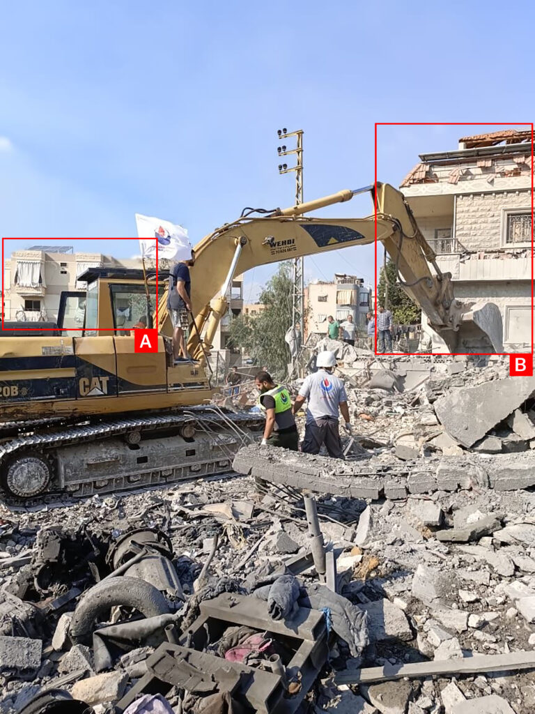 Posts emphasised the initial rescue efforts: Facebook user Ali Khaled first posted that five civilians had been killed and a number of people had been wounded in the bombing, and that ambulance, relief, and civil defense crews were working to remove the rubble and transport the injured. The post was accompanied by a video which showed a fire truck was working to extinguish a fire. Further images posted by Souhail Mahmood show civil defense members working with excavation equipment amid the extensive rubble. User @alkawthartvir posted to X (formerly Twitter) that the bombing resulted in “massive destruction”, and shared video and images showing significant damage to several buildings.