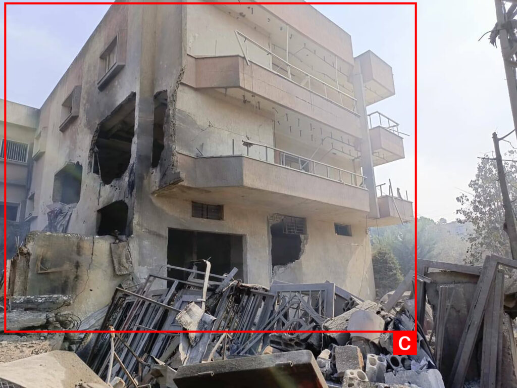 Reports of the incident mention a residential building being struck in the town of Choukine (شوكين) in the Nabatieh District (قضاء النبطية). Analysing visual material from sources we have narrowed down the location to these exact coordinates: 33.358236, 35.465366.