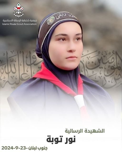 Photographs shared by the Mayfadoun troops of the Islamic Risala Scouts Association later depicted a funeral procession for Nour and Samar, showing a crowd gathered in prayer behind the victims. Nour was a member of the Association of Scouts of the Islamic Message, also known as “Al-Risala Scouts,” as identified in a message posted by the association and the Amal Movement memorializing their “missionary guide,” Nour. Nour is pictured in a scout uniform in multiple photos. Al-Risala Scouts Organisation is a member of the Scouts Federation of Lebanon, and the Federation itself is part of the World Organisation of the Scout Movement.