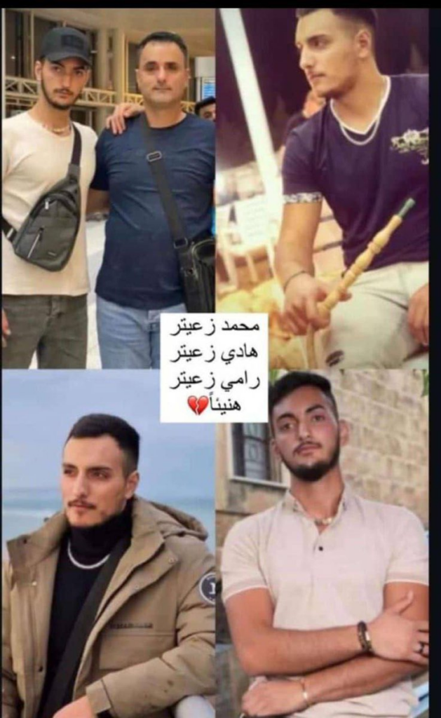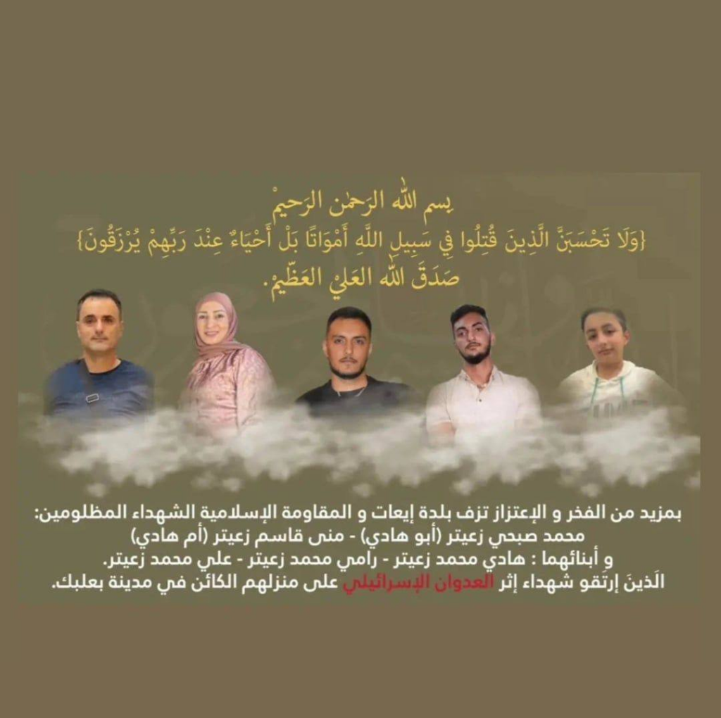 The family members killed in the strike were Mohammad Sobhi Maroun Zuaiter, his wife Mona Qassem Zuaiter, and their three sons, Hadi Mohammad Zuaiter, Ramy Mohammad Zuaiter, and Ali Mohammad Zuaiter. They left behind one surviving son, Ahmed Zuaiter.