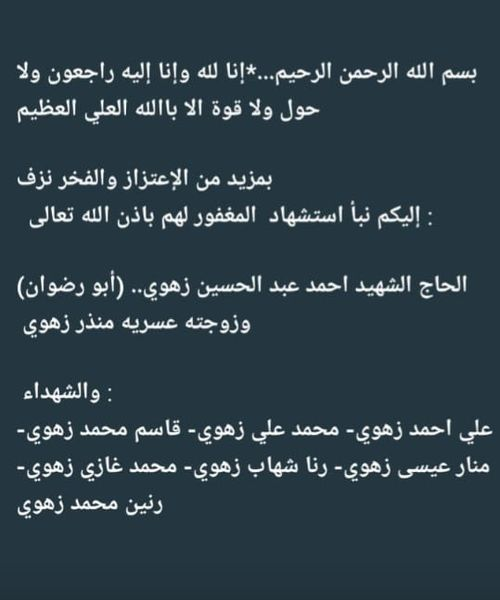 An elderly man, Haji Ahmed Abdel Hussein Salama Zahawi (Abu Radwan) was killed alongside his wife, Haja Asriya Munther Zahawi. Also reported killed were Muhammad Ali Zahawi, Qasim Muhammad Zahawi, Shorouk Fawaz Melhem, Manar Issa Zahawi, Rana Shihab Zahawi, Muhammad Ghazi Zahawi, and Raneem Muhammad Zahawi. Although the sources did not specify all the family relations among the victims, we can assume that Qasim and Raneem were children of either Muhammad Ali Zahawi or Muhammad Ghazi Zahawi based on their names.