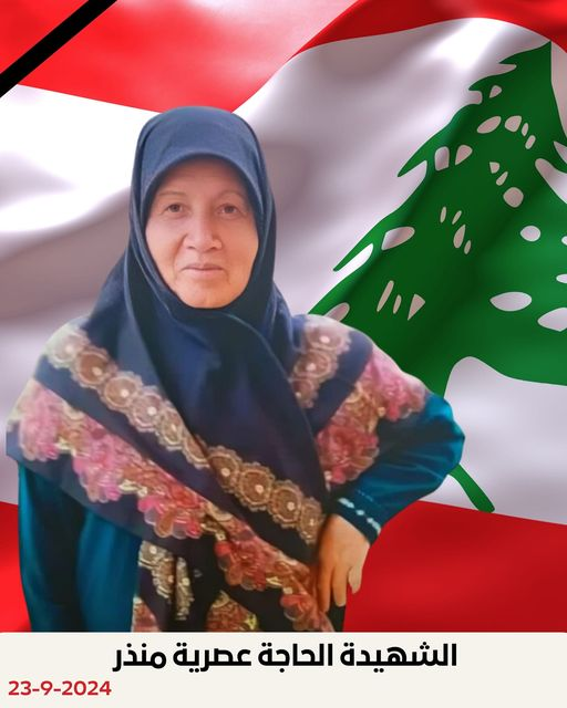 On Facebook, Mostafa Hamze shared a photo of “the martyr” Asriya Munther Zahawi and described her as “Hajja…who rose to prominence in the Majdal Salam massacre committed by the [Israeli] enemy.” Zeinat Munzar shared a picture of Asriya superimposed in front of a Lebanese flag and announced that “my aunt is a martyr of [Israeli] treachery.” Asriya was an elderly woman and she was seen in the pictures wearing a long-sleeved green dress and an embroidered black headscarf.