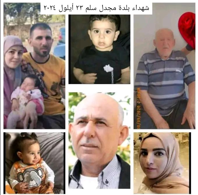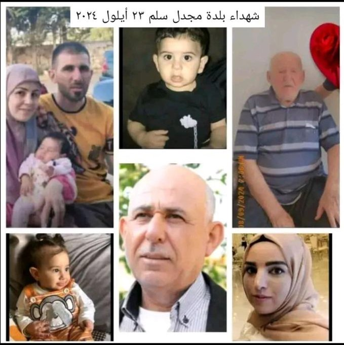 Offering a final count of the dead, the Municipality of Majdal Salam announced online that “in recognition of God’s will and destiny, we mourn to you the martyrdom of your loved ones who were killed as a result of the treacherous [Israeli] aggression: Martyr Mujahid Hajj Ali Ahmed Zahawi (Abu Hussein), Haj Ahmed Abdel Hussein Salama Zahawi (Abu Radwan), Hajja Asriya Munther (wife of Hajj Abu Radwan), Muhammad Ali Zahawi, Qasim Muhammad Zahawi, Shorouk Fawaz Melhem, Muhammad Ghazi Zahawi, Raneem Muhammad Zahawi, Manar Issa Zahawi. The pure bodies will be prayed over and buried in the kindergarten of their town, Majdal Salam, on Wednesday, September 25, 2024, at 11:00 before noon.”