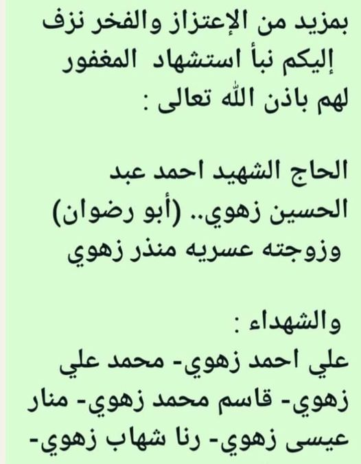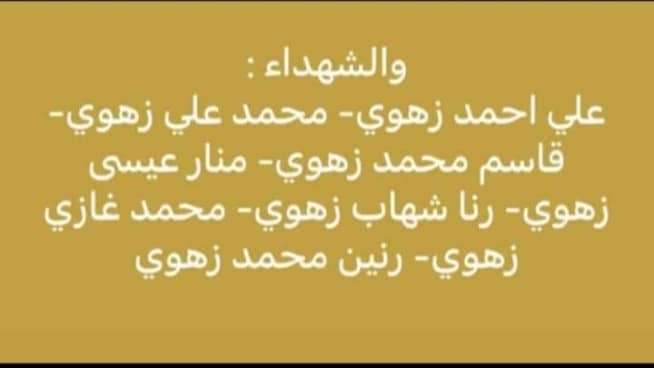 On Facebook, Dr Omran Hazwi announced that “the enemy committed a massacre on a family of my cousins. They were all martyred, from the grandfather and his wife to the son to the grandchildren.” He also added a list of the victims of the strike.