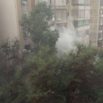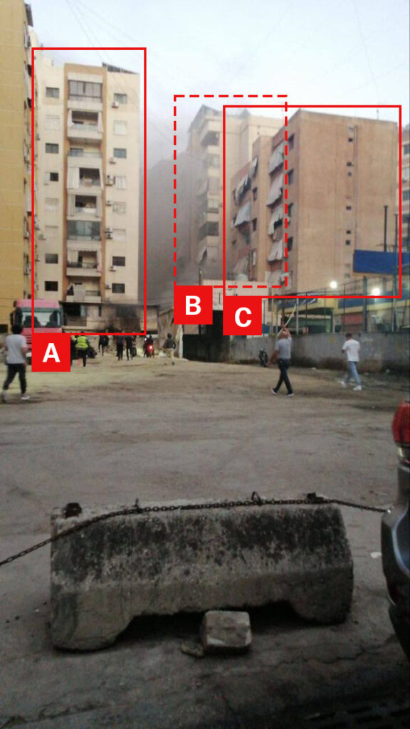 A video posted by @LBCI_NEWS shows smoke coming from an apartment building, which is similarly captured in an image from @Khabrnews1. In another video posted by Lebanos, an ambulance can be seen trying to go down a crowded street in Bir al-Abd. Journalist Hussein Ayyad is also recorded at the site of the strike, which destroyed multiple garage doors and a vehicle on the first floor and entered an apartment on the second floor of a multi-story apartment building.