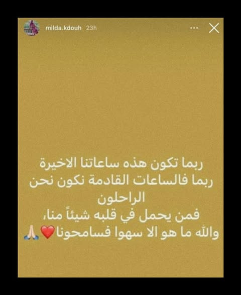 Rayan Kdouh remembered the late Milda Qadouh as a calm and reserved young woman, whose beauty radiated both inside and out. He added: “Milda, who asked for martyrdom and loved it, and God answered her pure heart and included her among the martyrs.” He added several images of Milda, a young woman. In one of the images, she is seen holding a birthday cake with her name written on it.