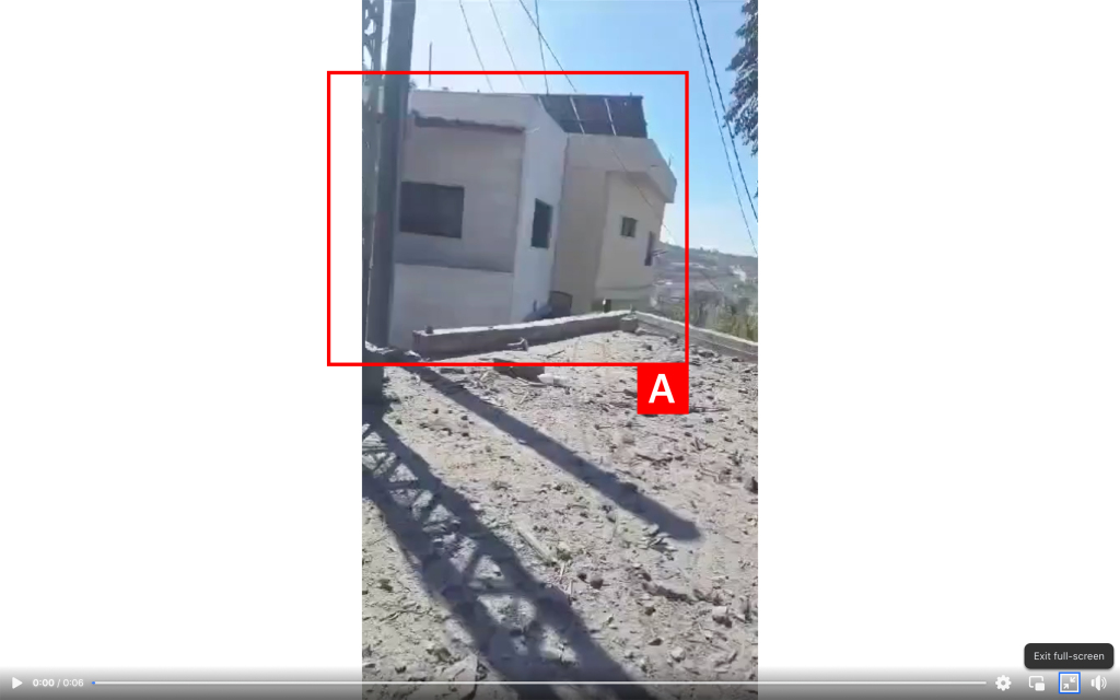 Reports of the incident mention a residential building being struck in the town of Tayr Falsay (طير فلساي) in Tyre District (قضاء صور). Analysing audio-visual material from sources, we have narrowed the location down to the following exact coordinates: 33.309271, 35.346673.