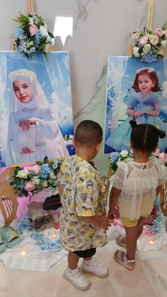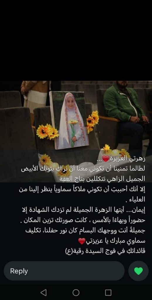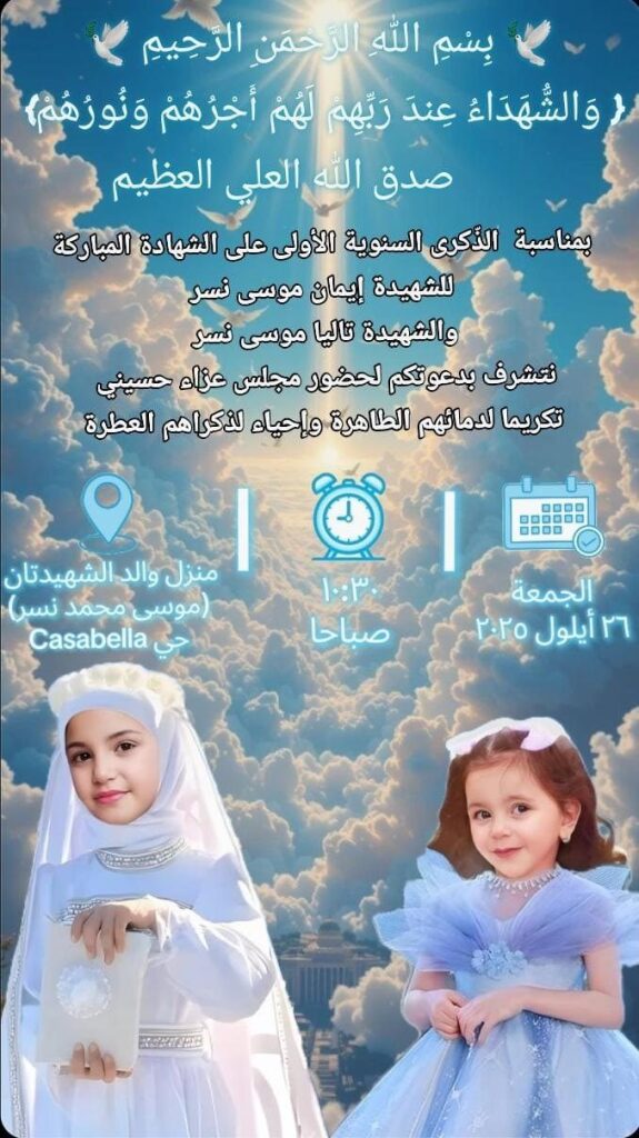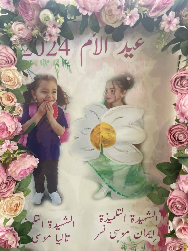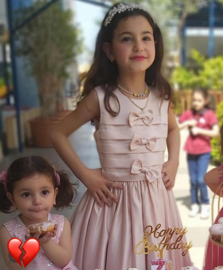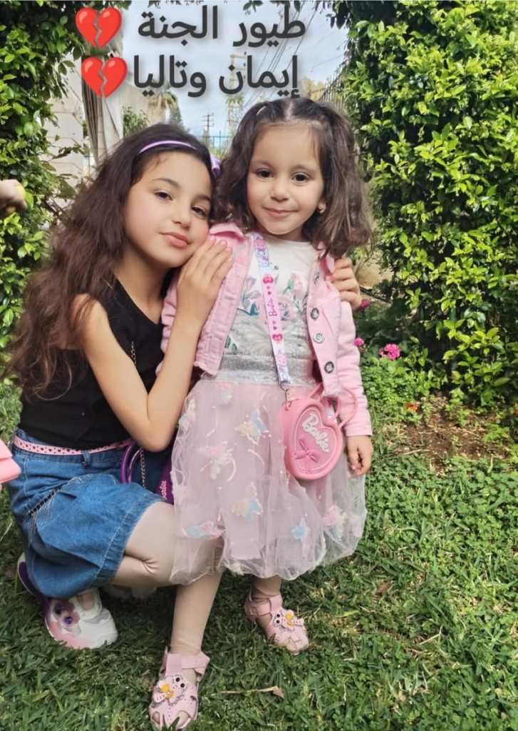 Iman and Talia were both young girls, as shown in a number of photos uploaded by different users; some depict the two together, and others show Iman on her own. A Facebook post by Milad Sebaly expressed condolences on behalf of the sisters’ school and wrote that Talia had “insisted on accompanying Iman” to her death. According to Milad, a mother of Iman, whose words were reportedly “dripping with tears and blood”, informed the kindergarten about the death of their beautiful and brilliant third-grade student, Iman Musa Nasr. However, the mother, who was herself injured and staying at a hospital, did not know about the death of her second daughter, Talia. The author of the post mourned the deaths of two young girls: