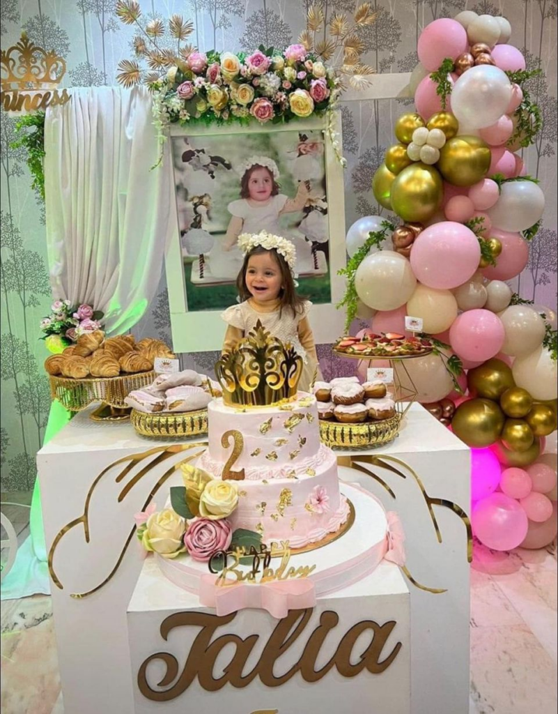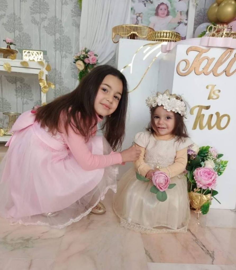 A picture shared by PalinfoAr showed both girls at a birthday celebration. Iman is pictured standing in front of her; a cake topper appears to show she was celebrating her seventh birthday. Another photograph, shared by Facebook user Kalad, shows a celebration for Talia. A sign – “Talia is Two” – is clearly visible. The post from Kalad offered condolences to “The family of Muhammad Nasr Abu Musa,” suggesting that Muhammad was the father of the two girls and husband to Rokaya. Kalad’s post also showed an image of a badly damaged residential building and car – the same image shared by Nabila Fadel to Twitter/X.