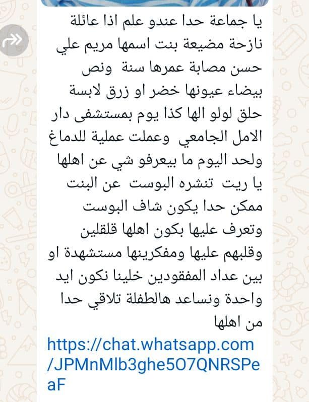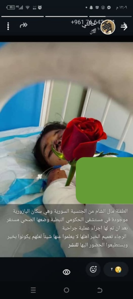 All of the posts mentioning Mal identified her as a girl of “Syrian nationality” residing in Al-Bazouriyya. A number of posts were appeals to social media users to share the post, in an effort to try to locate her family, mentioning that Mal was undergoing surgery at the Nabatieh Governmental Hospital. Though her condition was described as “stable,” a graphic image of her treatment at the hospital was shared by a number of accounts across Facebook and X/Twitter, with some censoring her facial injury and others leaving it visible.