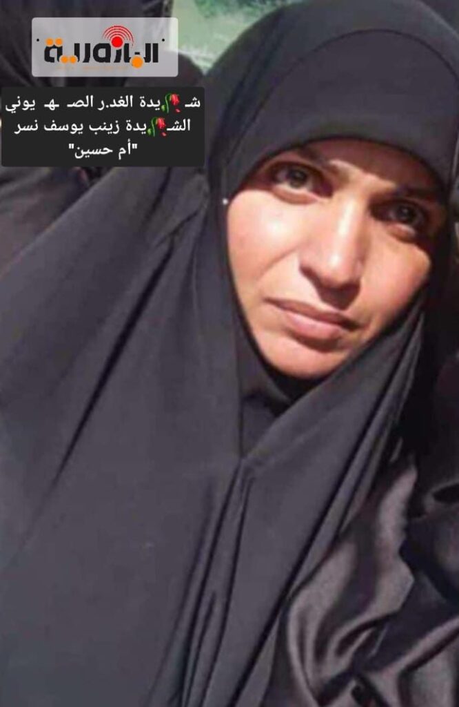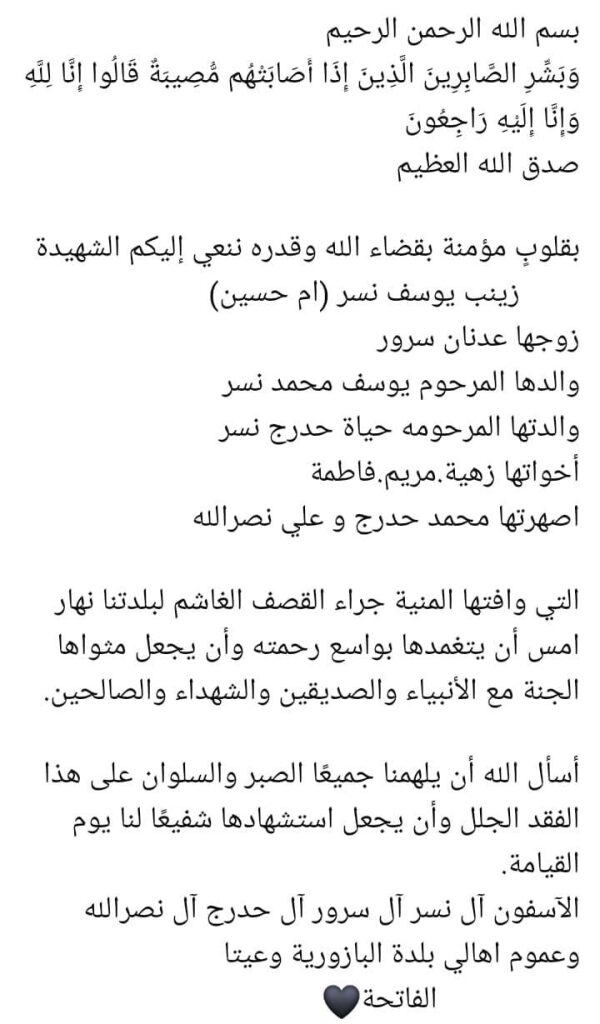 Twitter/X user @HUSSEIN SROUR also announced Zainab’s death, as did Facebook user Zaynab, who offered condolences to Zainab’s husband Adnan Srour, her father the late Youssef Mohammed Nesser, her mother the late Hayat Hadraj Nesser, and her sisters Zahia, Miriam, and Fatima, as well as her brothers-in-law Ali Nasrallah and Mohammed Hadraj. Both users shared images of Zainab. In the photos, Zainab wears a black chador, and in the photo shared by Zaynab, she appears leaning against someone – presumably a loved one – and smiles toward the camera. Zaynab closed her post asking “God to inspire us all with patience and solace for this great loss and to make her martyrdom an intercession for us on the Day of Judgment. The mourners, the Al-Nasr family, the Al-Surur family, the Al-Hadraj family, the Al-Nasrallah family, and all the people of the town of Al-Bazourieh and Aita.”
