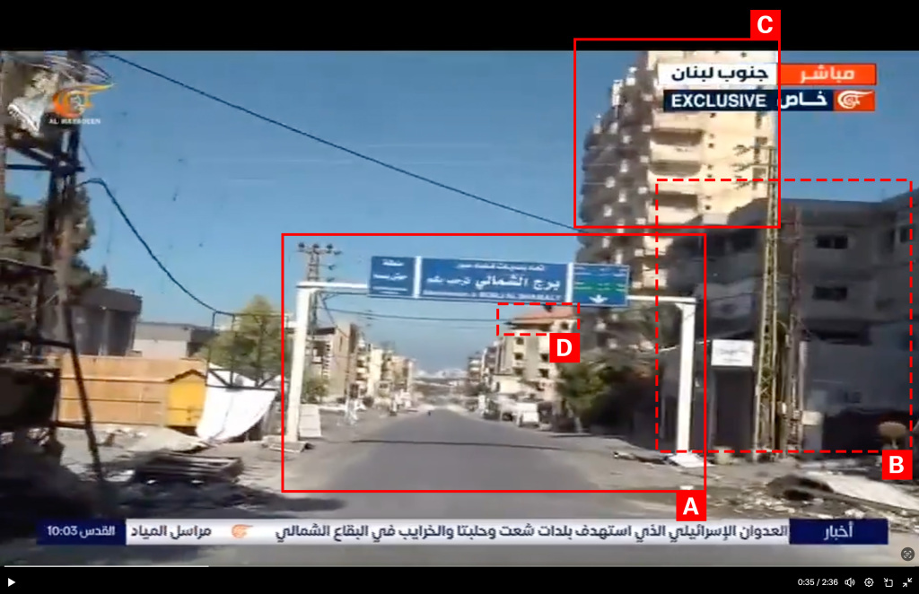 “I am standing now in the town of Burj al-Shamali at the entrance to inspect the targets that are being hit by Israeli warplanes. Here on the side of the road is this civilian residential building, and this is a restaurant called Zaher Restaurant. This restaurant was targeted by an Israeli airstrike that led to its destruction and the destruction of the upper floors above it. We will go in with the camera to show this commercial establishment that was exposed to the raids. This is a sample of the raids carried out by the Israeli Air Force, which they say are Hezbollah missile platforms and so on. They insist on propaganda that there are missiles inside these buildings, and as we see, this is a restaurant, these are civilian homes, and a civilian building. In the military sense, a missile cannot be hidden inside a civilian building.”