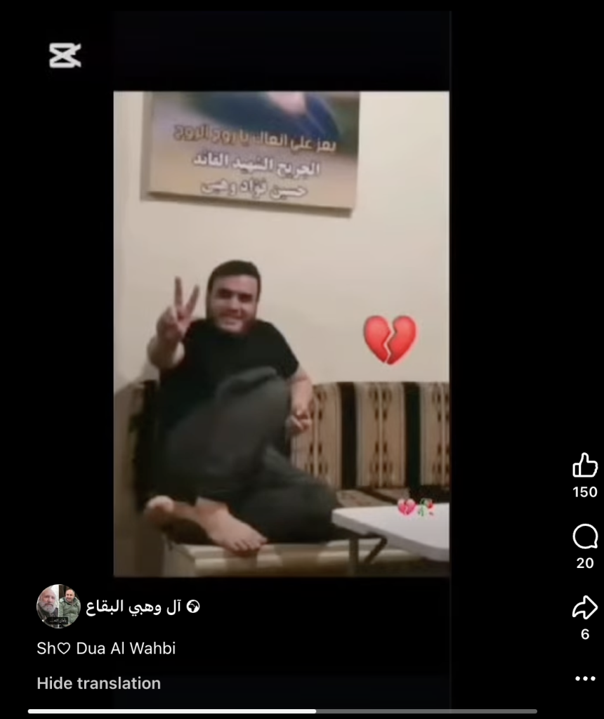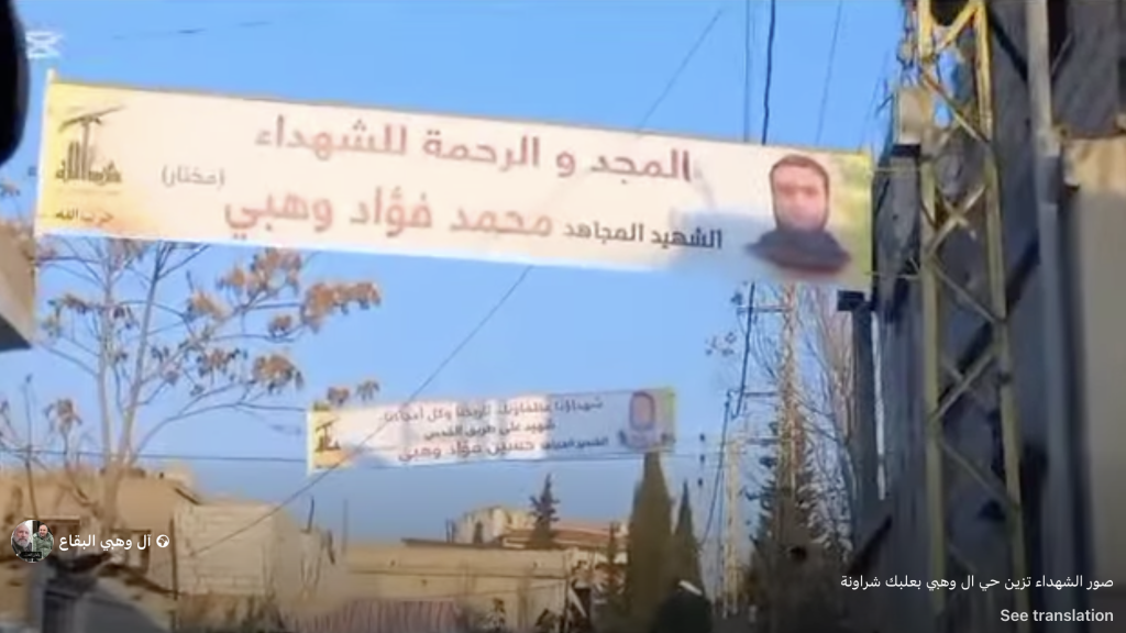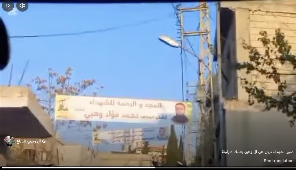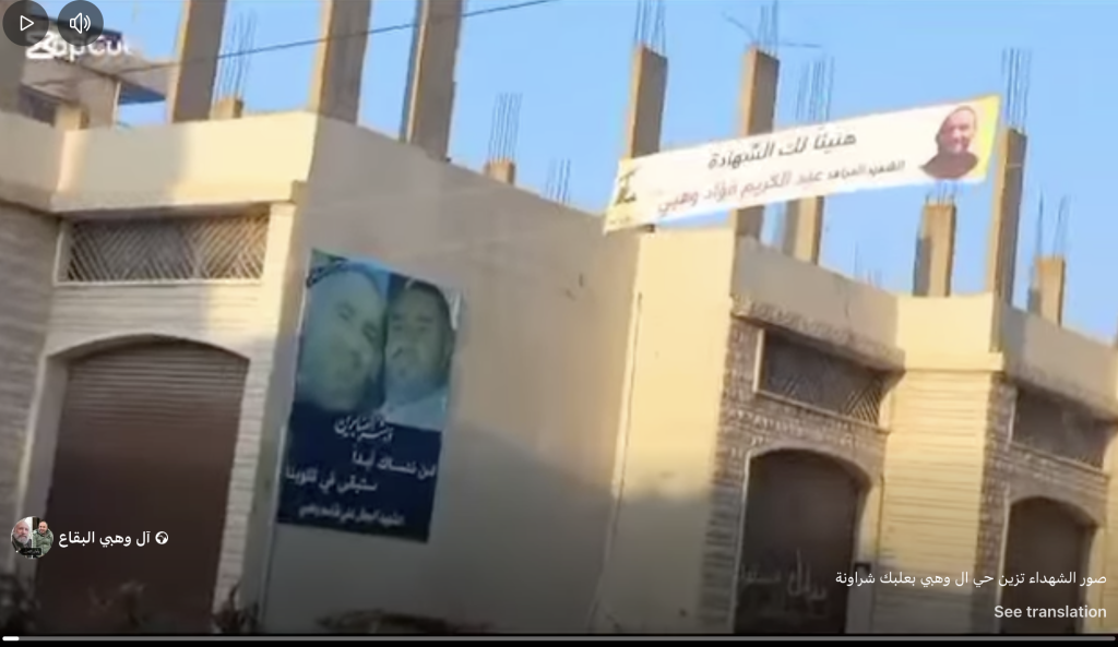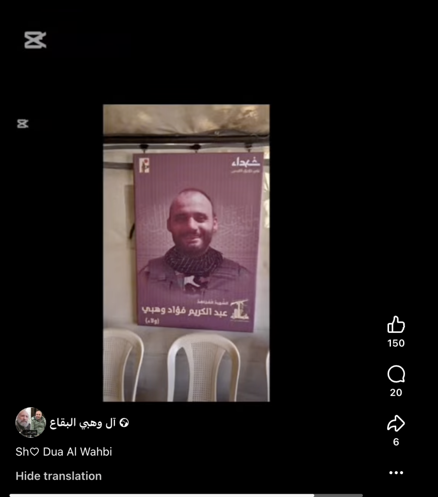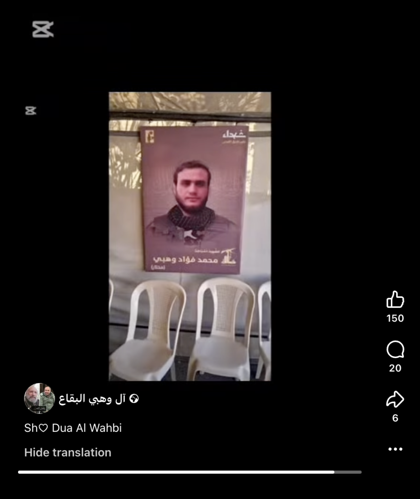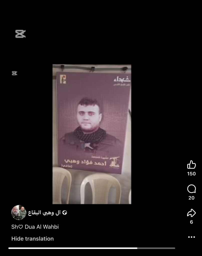 Video reels shared by Facebook account ‘Al Wahbi Al-Biqa” showed Hezbollah martyr photos made for Ahmed Fouad Wahbi, Abdul Karim Fouad Wahbi, and Mohamed Fouad Wahbi. Speifically, the three men were individually commemorated as ‘martyred mujahed’s. Though the term is not exclusively militant in nature, Airwars has found that when the term is invoked by members of Hezbollah, it generally indicates militant affiliation, rather than purely political. For this reason, the three men have been recorded as militants. This will be updated should additional information become available.